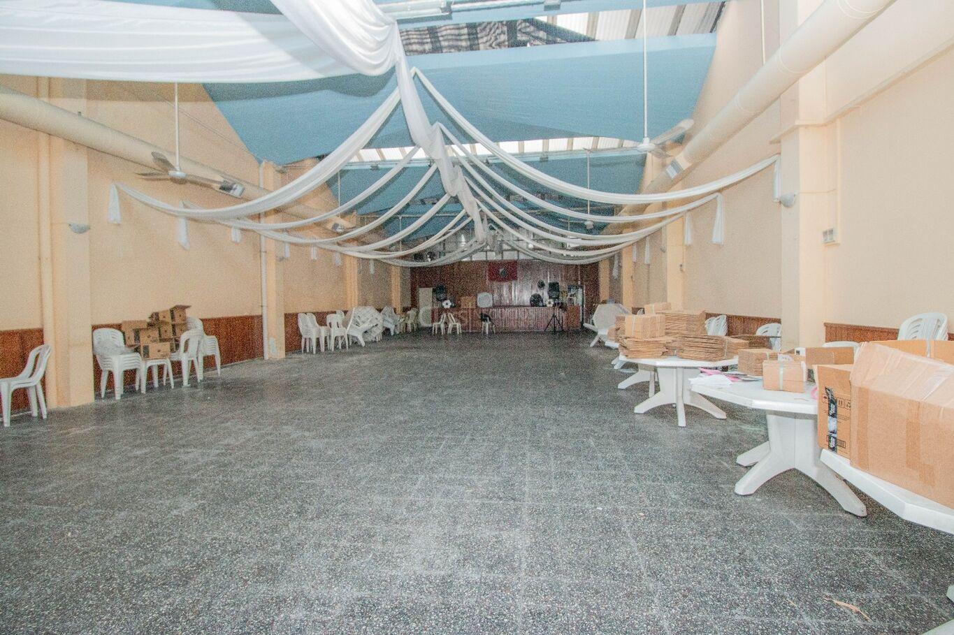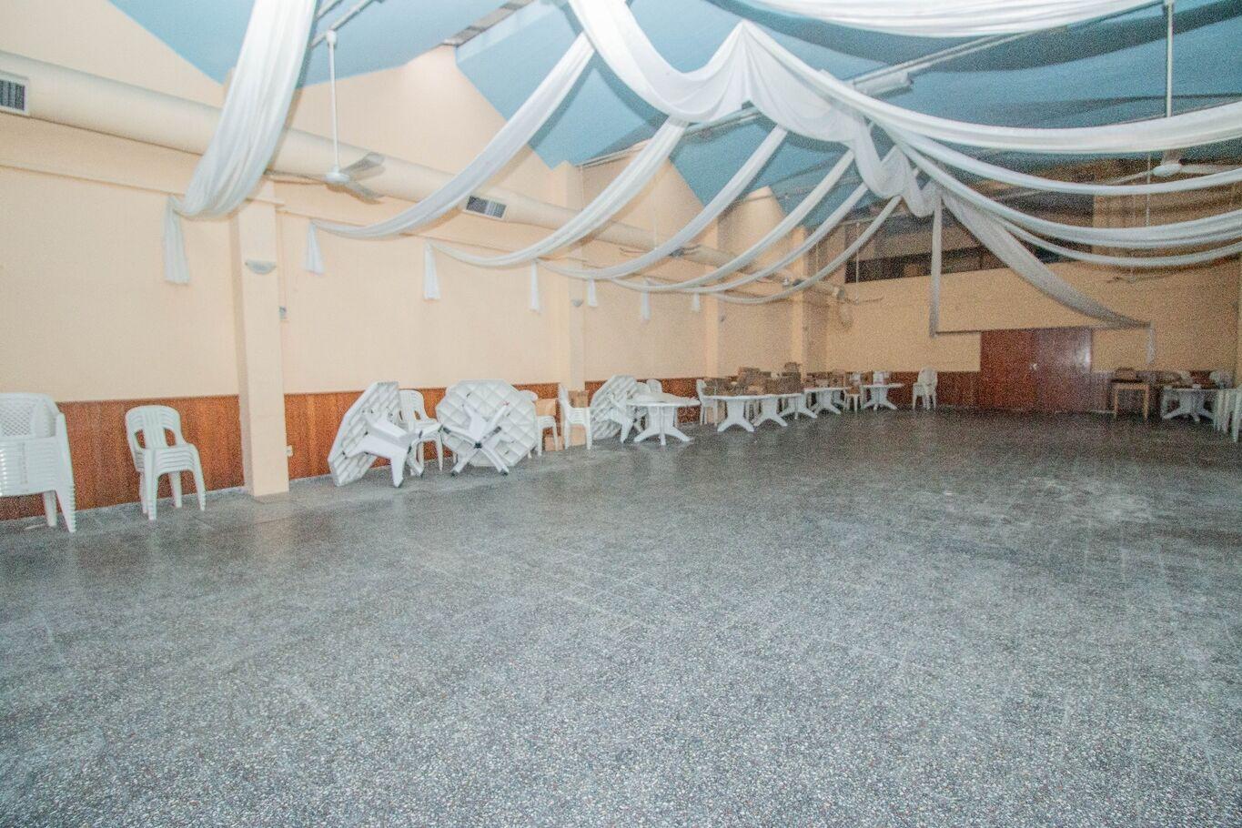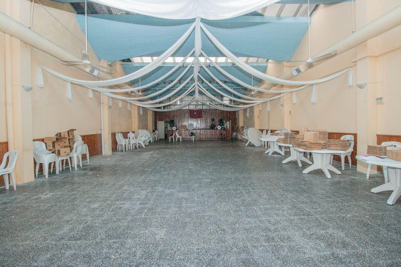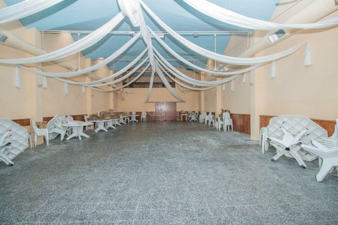 El gran salón tiene pisos de monolítico y un escenario en madera. Detrás del escenario se ubica la cocina, el parrillero, el baño para empleados y un local destinado a almacenamiento y refrigeración.
